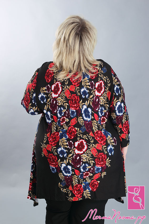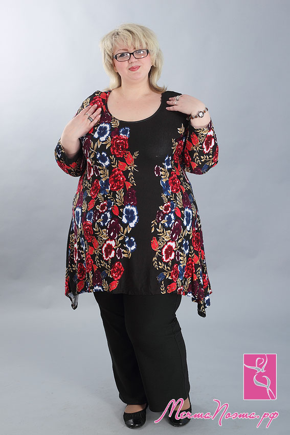 Стильная туника из тонкого эластичного трикотажного полотна. Модель расклешена книзу за счет боковых вставок-клиньев. Спинка и полочка цельнокроеные. Полукруглый вырез горловины. Рукава втачные, 3/4. Линия низа удлинена по бокам. Сочетание принта и однотонной черной ткани зрительно вытягивает силуэт.